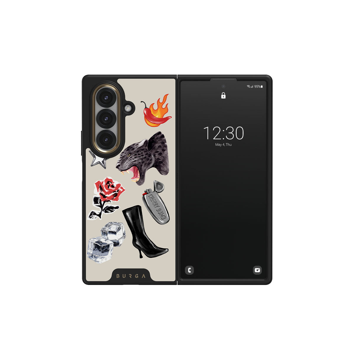 Kenmerken van dit design: zwarte panter, rode roos, brandende paprika, zilveren aansteker, zwarte knielaarzen, ijsblokjes, zilveren ster.