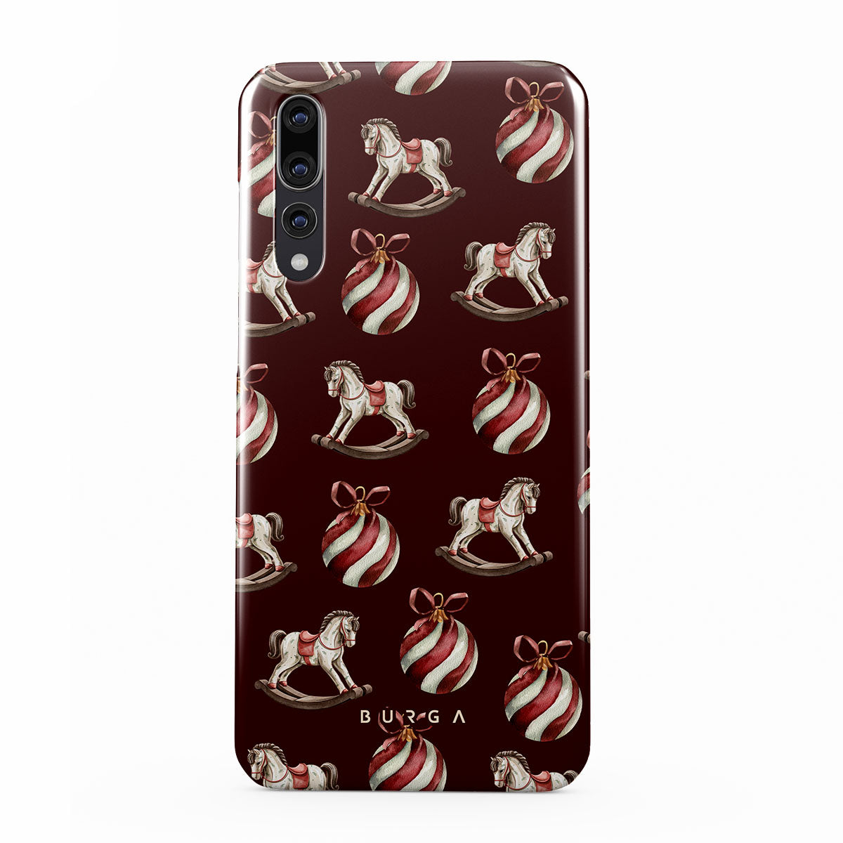 Dit ontwerp heeft: schommelpaarden, kerstballen, rood, kerst ontwerp