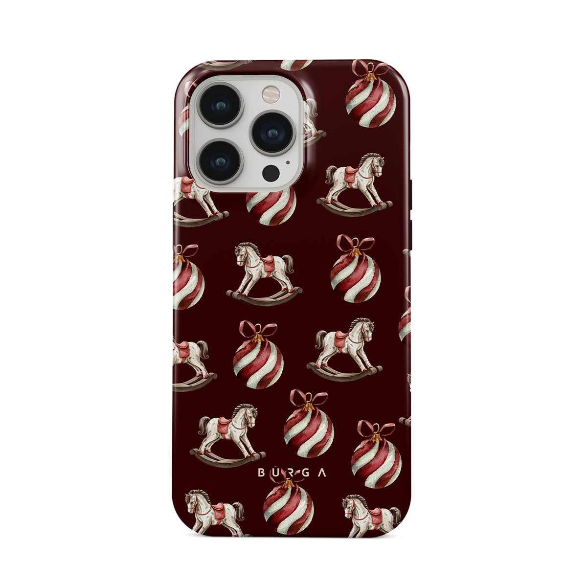 Dit ontwerp heeft: schommelpaarden, kerstballen, rood, kerst ontwerp