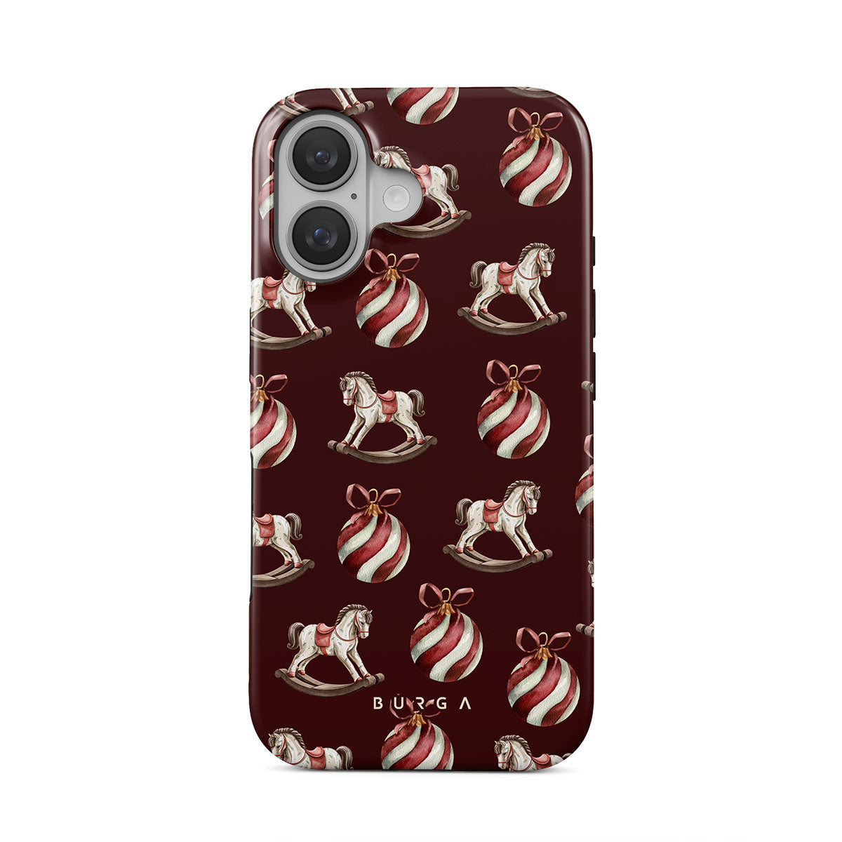 Dit ontwerp heeft: schommelpaarden, kerstballen, rood, kerst ontwerp