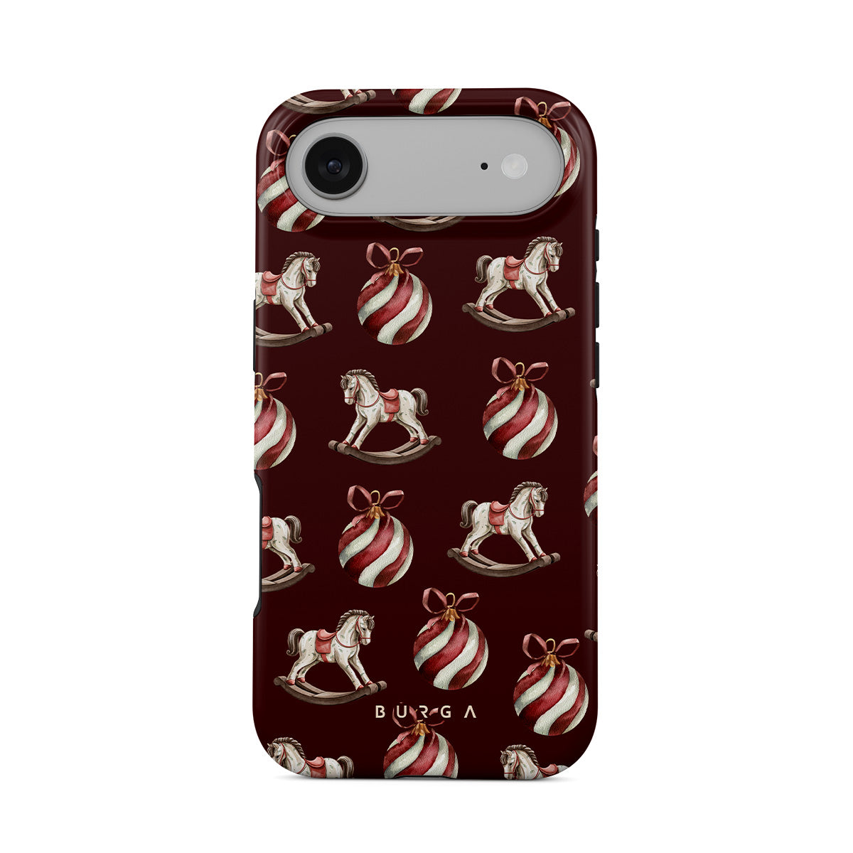 Dit ontwerp heeft: schommelpaarden, kerstballen, rood, kerst ontwerp