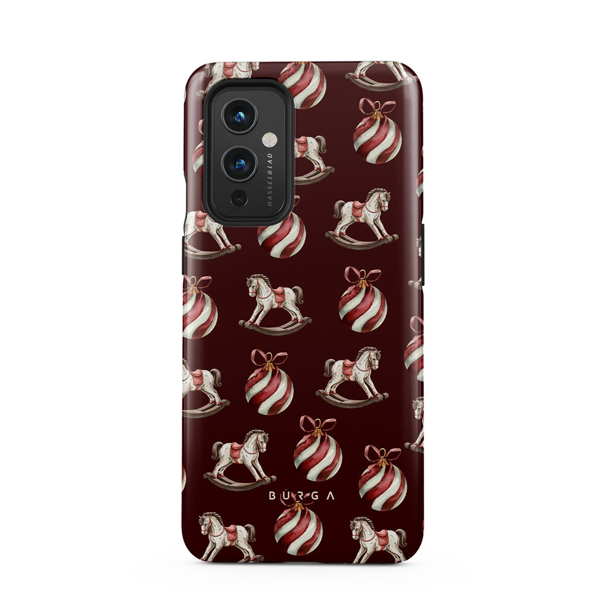 Dit ontwerp heeft: schommelpaarden, kerstballen, rood, kerst ontwerp