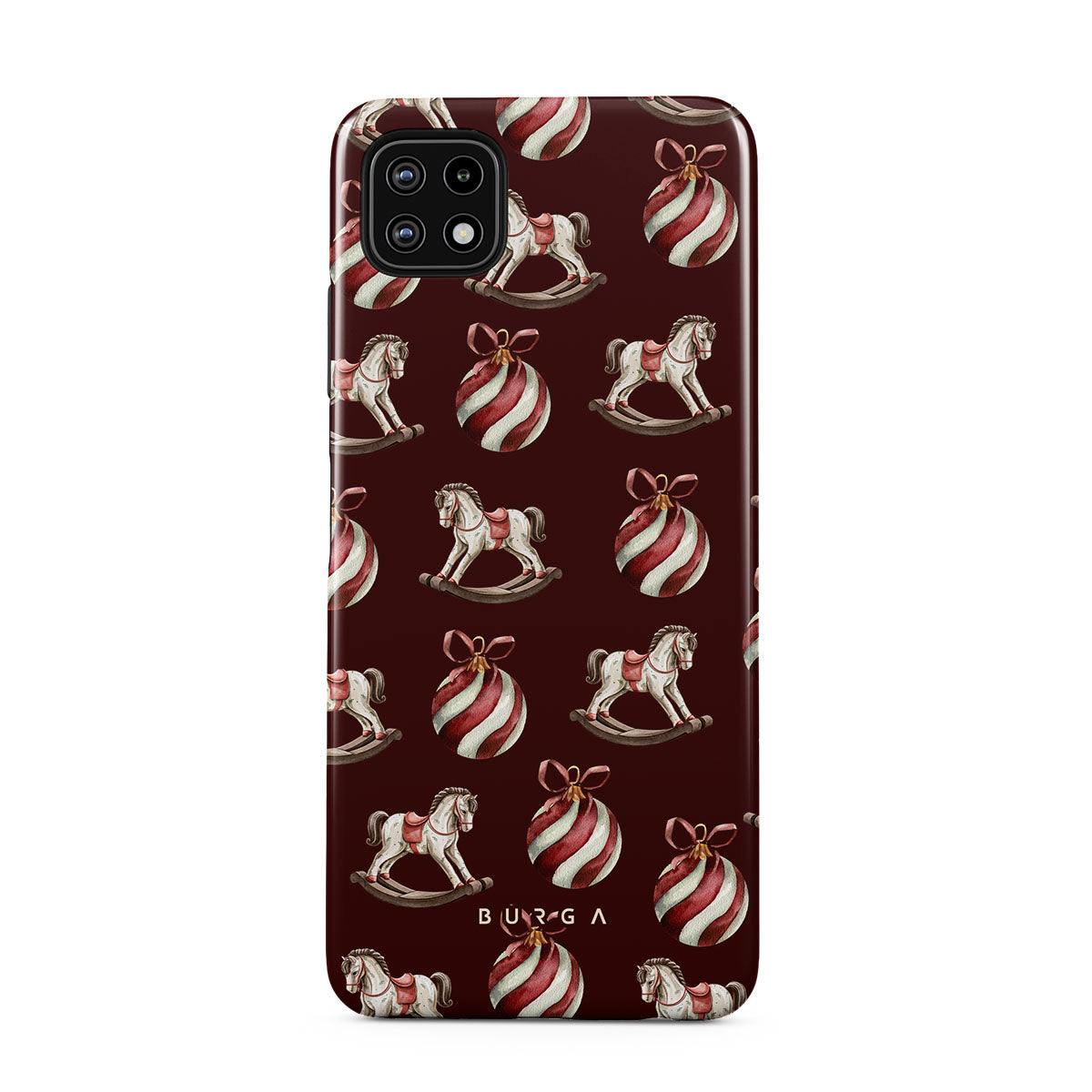 Dit ontwerp heeft: schommelpaarden, kerstballen, rood, kerst ontwerp