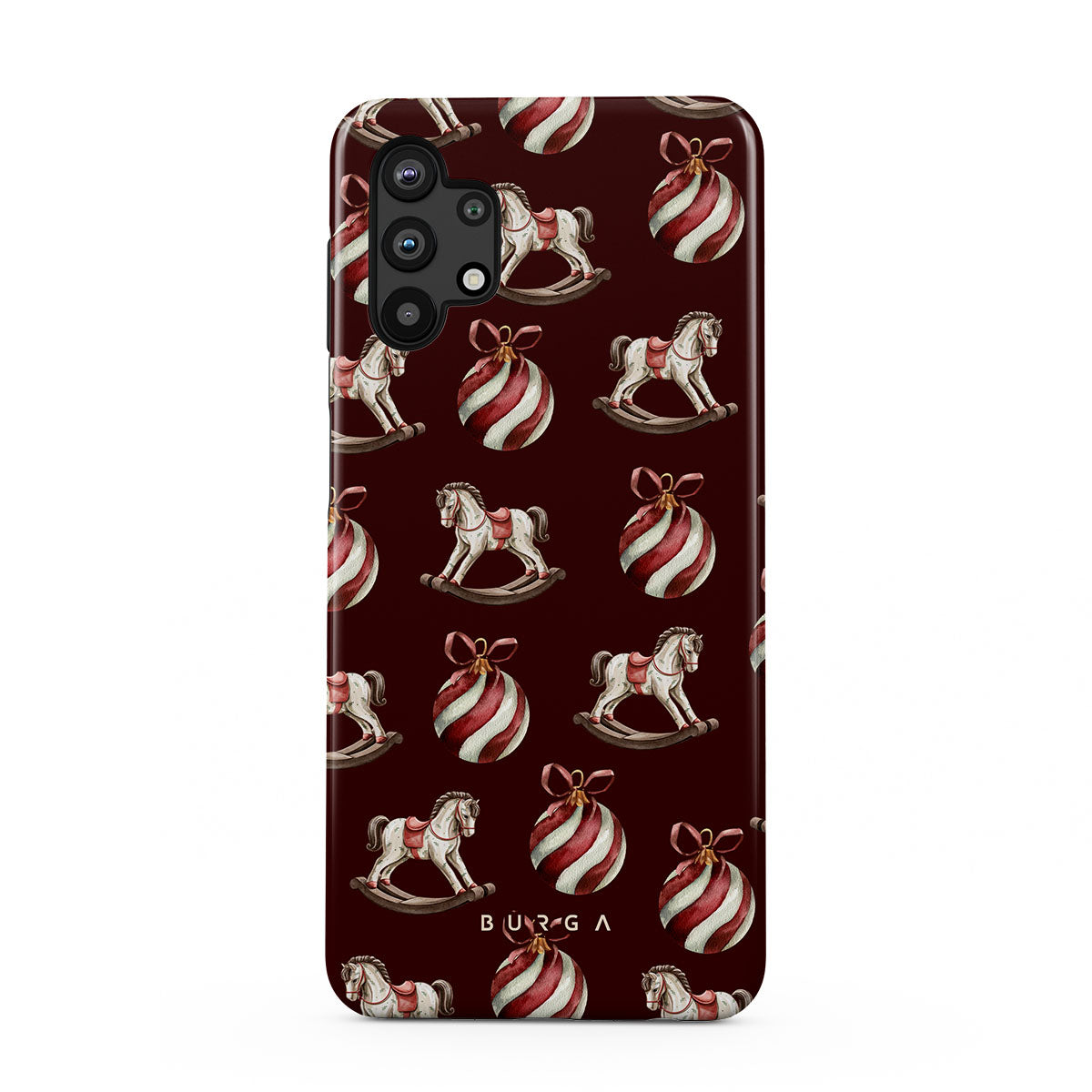 Dit ontwerp heeft: schommelpaarden, kerstballen, rood, kerst ontwerp