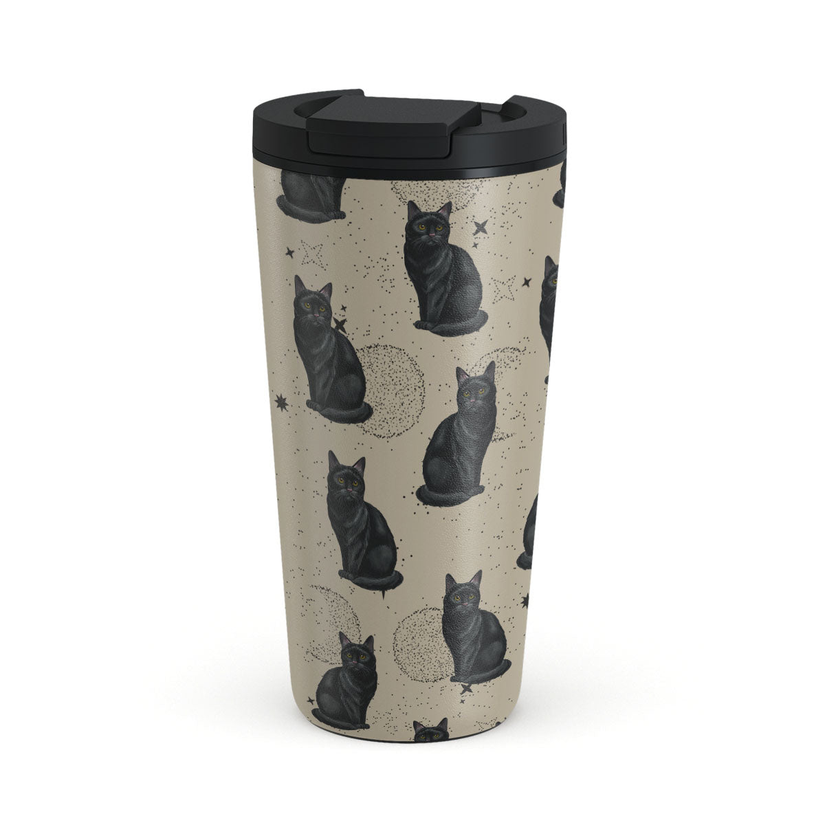 Kenmerken van dit design: zwarte katten, mystieke symbolen.