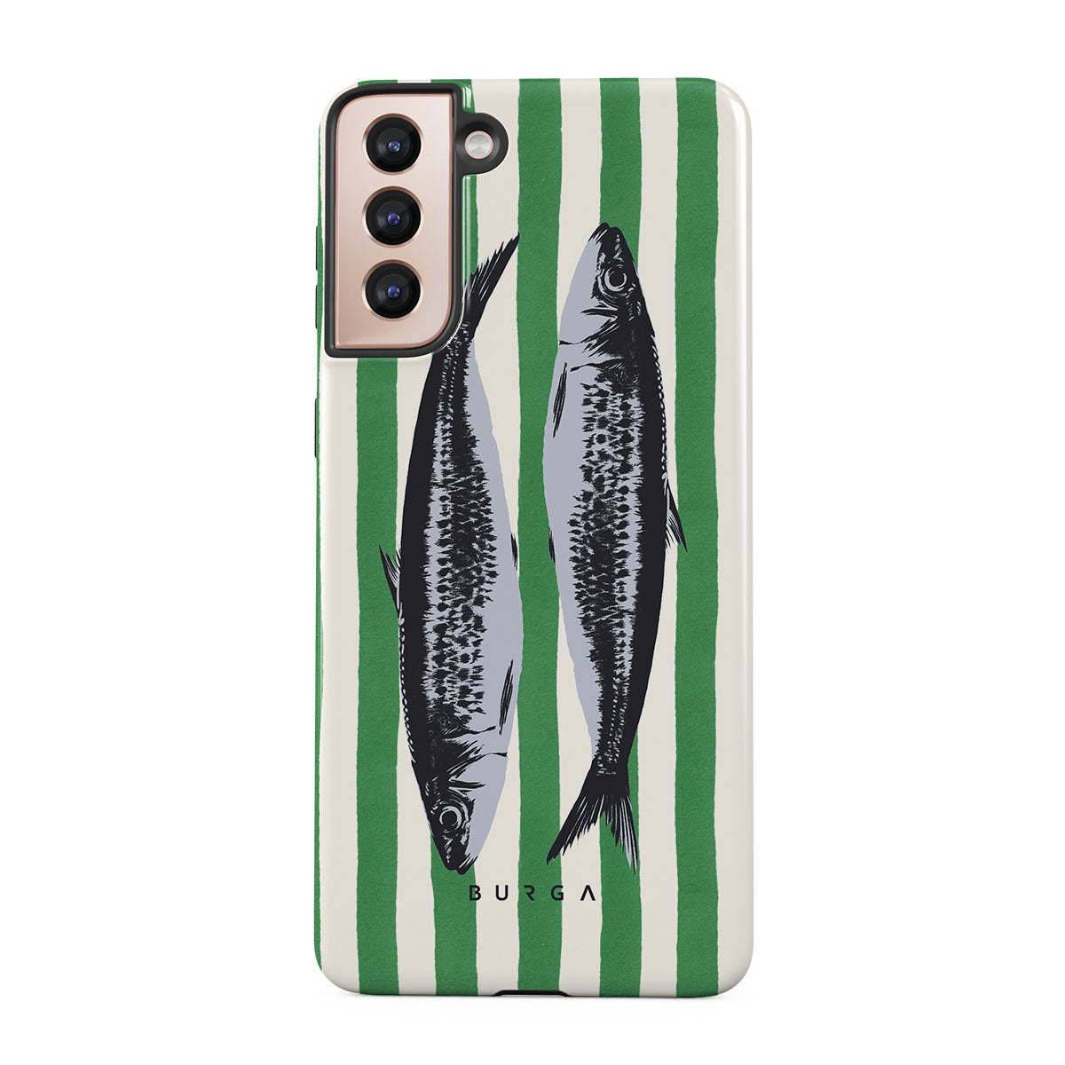 Kenmerken van dit design: Sardines, groene strepen, oceaanmotieven.