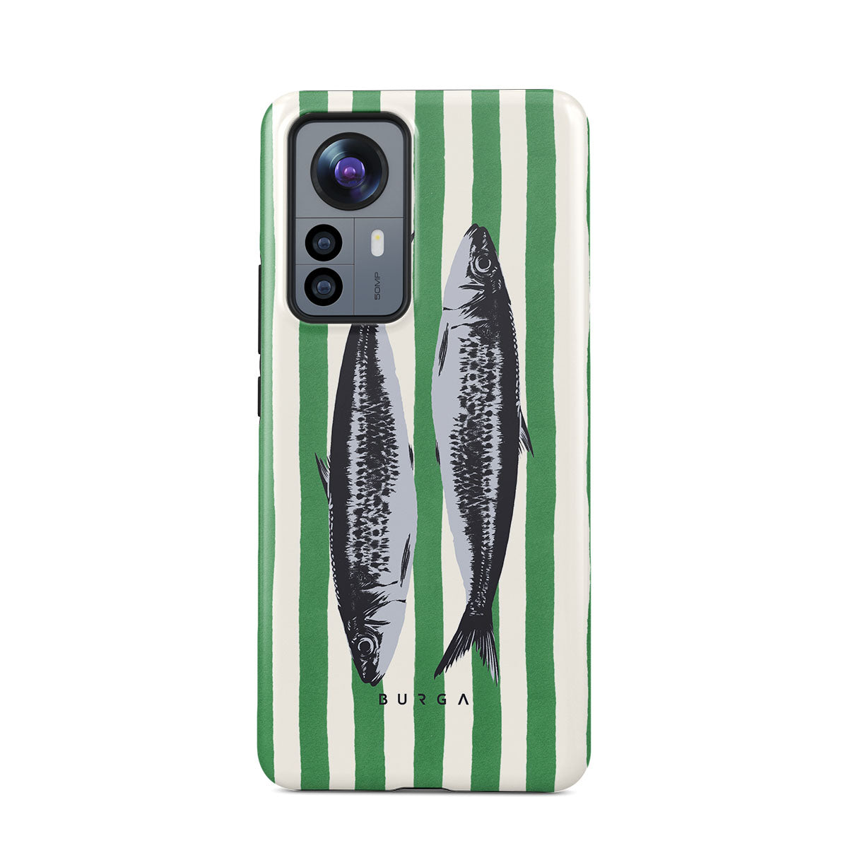 Kenmerken van dit design: Sardines, groene strepen, oceaanmotieven.