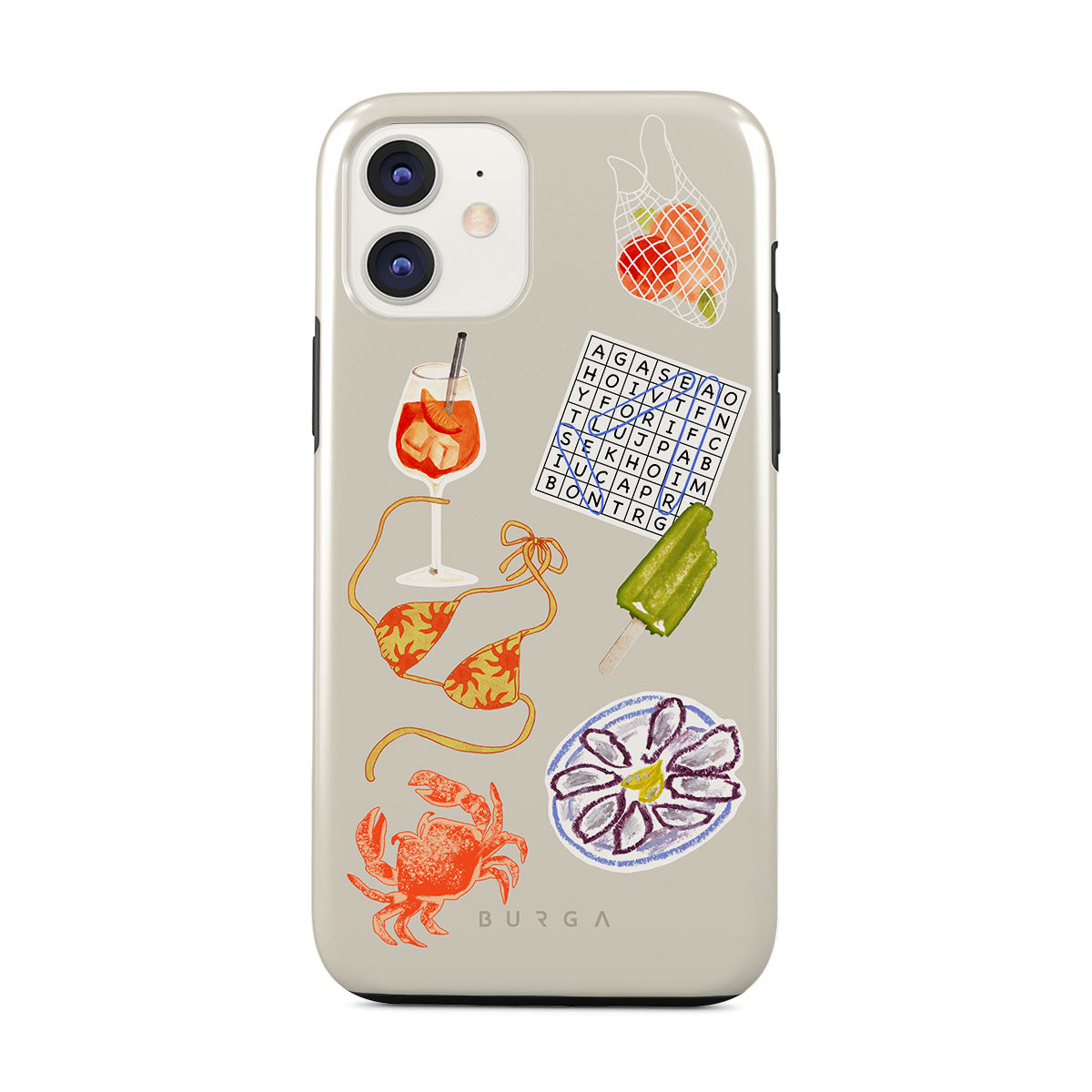 Kenmerken van dit design: krab, bord met oesters, ijsje, kruiswoordpuzzel, spritz-cocktail, bikinitop, fruit.