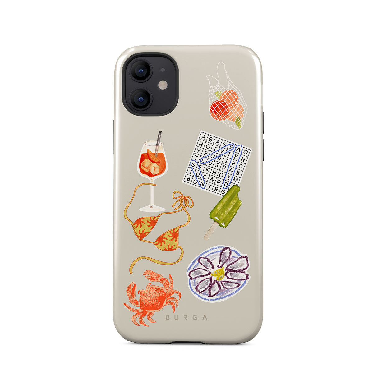 Kenmerken van dit design: krab, bord met oesters, ijsje, kruiswoordpuzzel, spritz-cocktail, bikinitop, fruit.