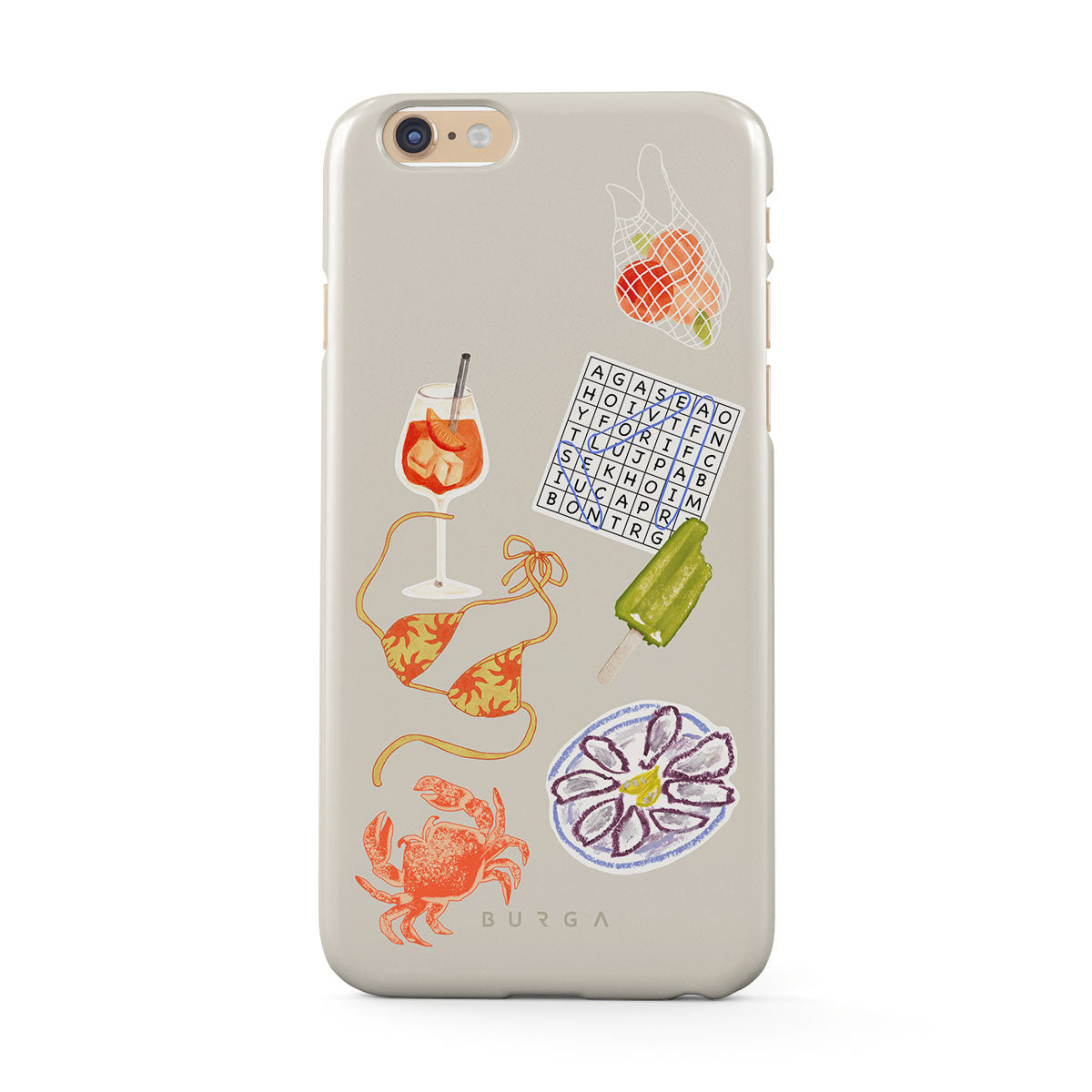 Kenmerken van dit design: krab, bord met oesters, ijsje, kruiswoordpuzzel, spritz-cocktail, bikinitop, fruit.