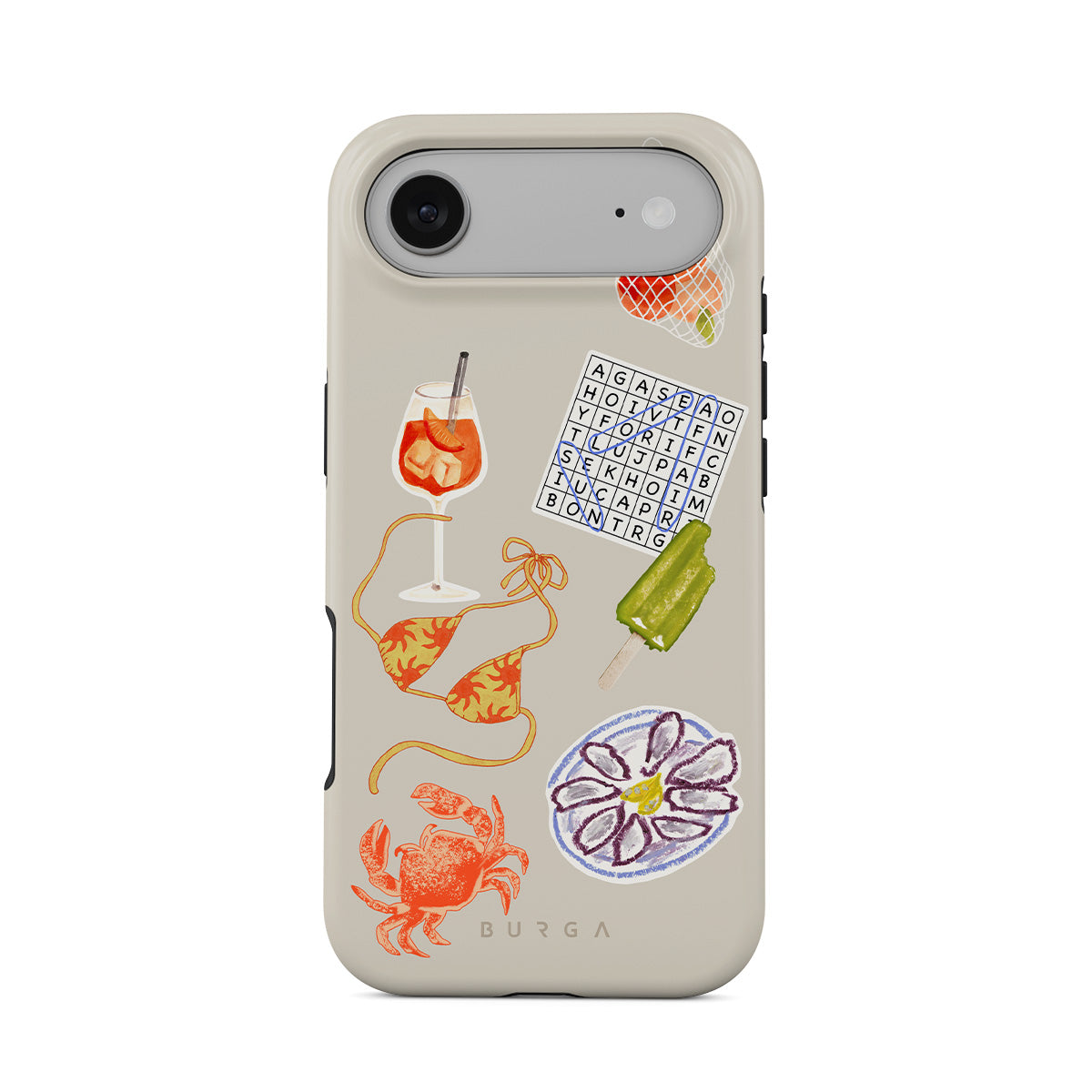 Kenmerken van dit design: krab, bord met oesters, ijsje, kruiswoordpuzzel, spritz-cocktail, bikinitop, fruit.