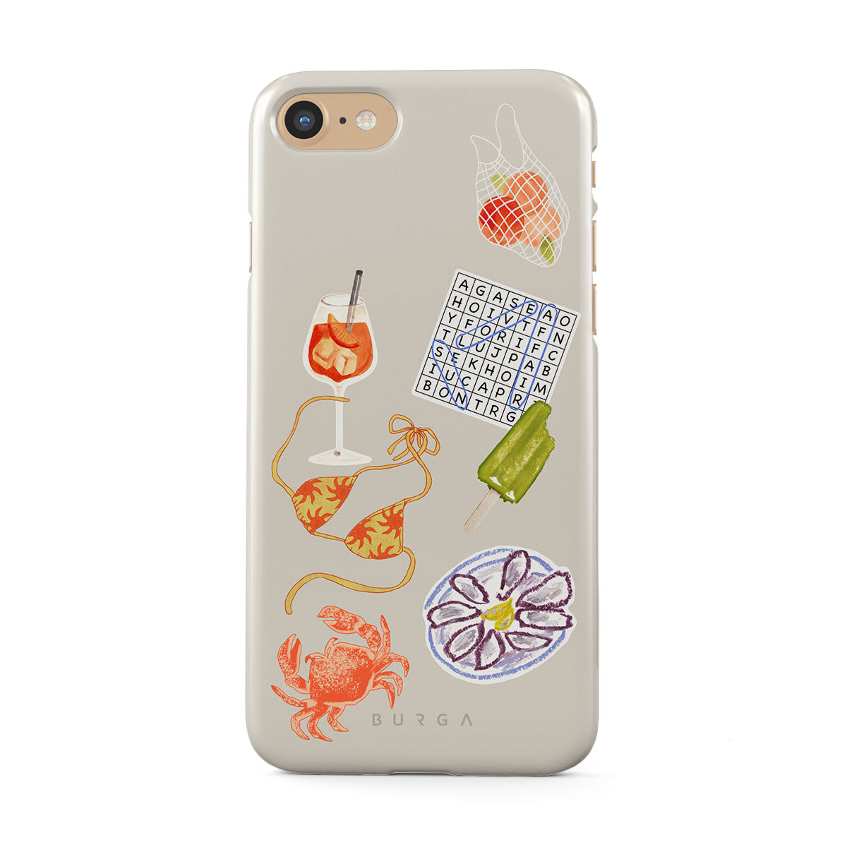 Kenmerken van dit design: krab, bord met oesters, ijsje, kruiswoordpuzzel, spritz-cocktail, bikinitop, fruit.