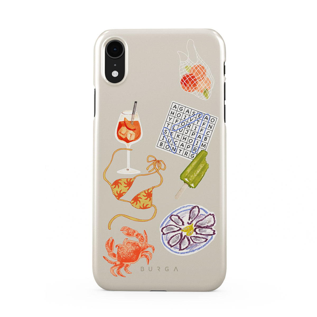 Kenmerken van dit design: krab, bord met oesters, ijsje, kruiswoordpuzzel, spritz-cocktail, bikinitop, fruit.