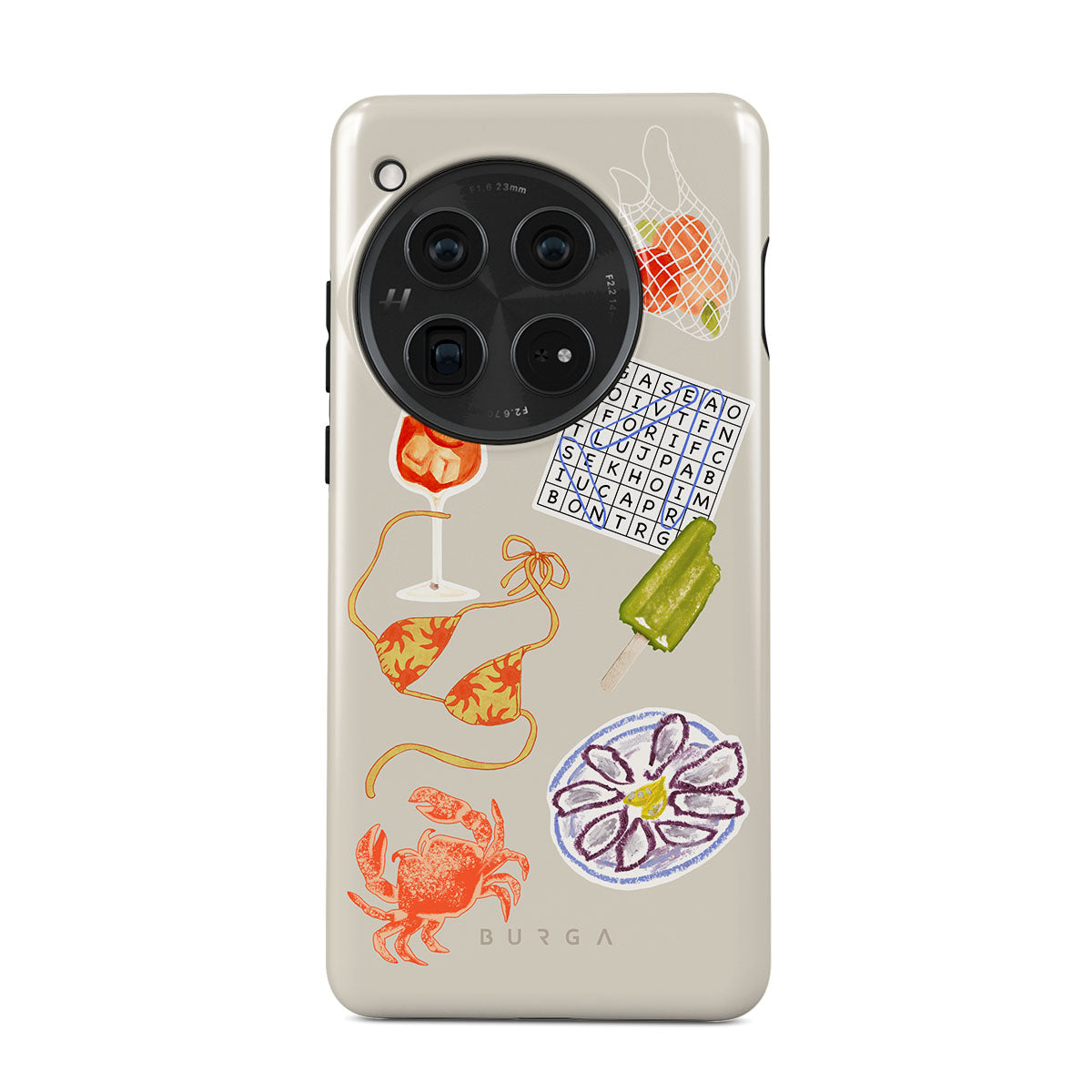 Kenmerken van dit design: krab, bord met oesters, ijsje, kruiswoordpuzzel, spritz-cocktail, bikinitop, fruit.