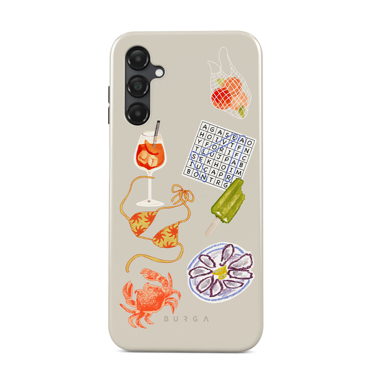 Kenmerken van dit design: krab, bord met oesters, ijsje, kruiswoordpuzzel, spritz-cocktail, bikinitop, fruit.
