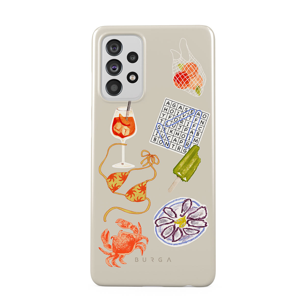 Kenmerken van dit design: krab, bord met oesters, ijsje, kruiswoordpuzzel, spritz-cocktail, bikinitop, fruit.