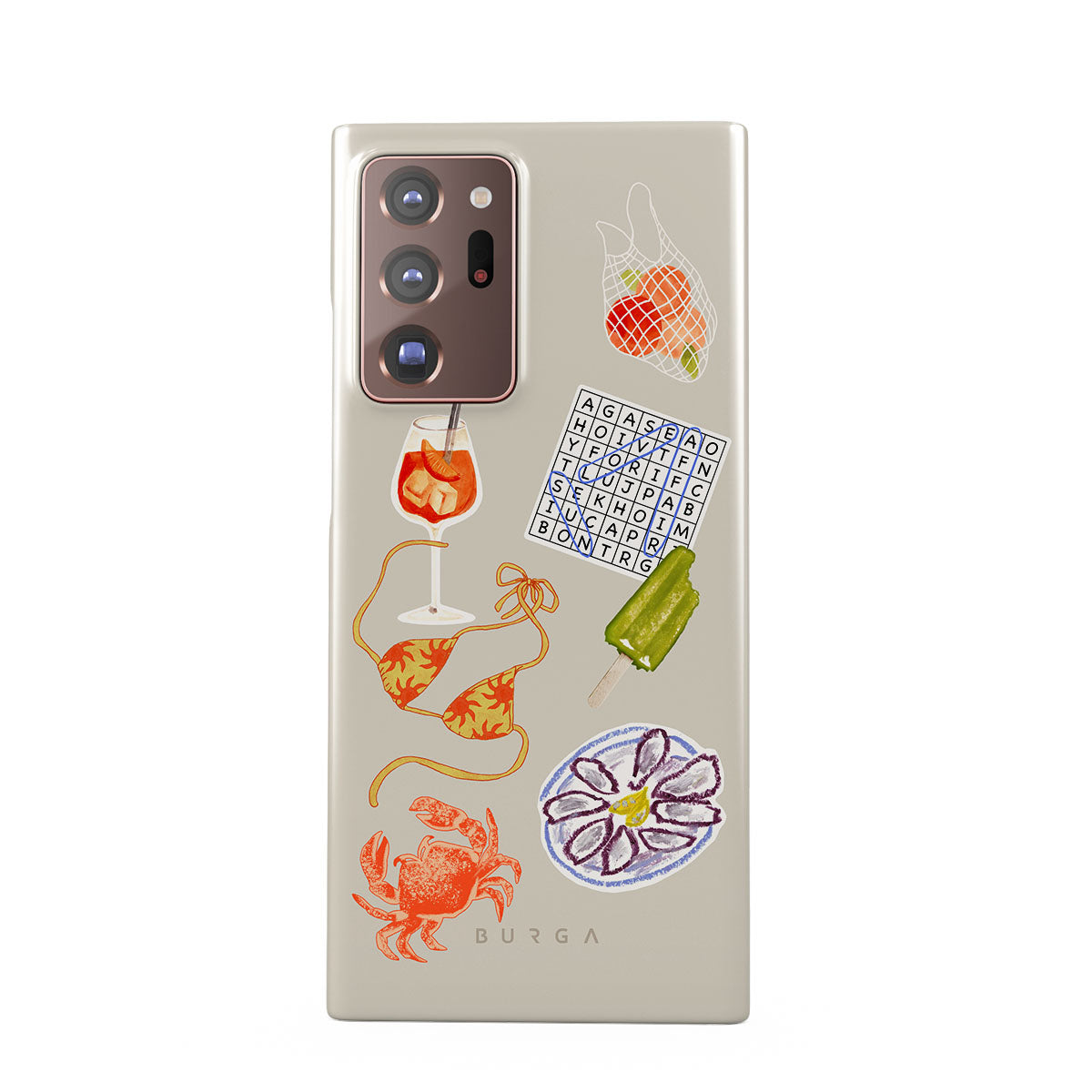 Kenmerken van dit design: krab, bord met oesters, ijsje, kruiswoordpuzzel, spritz-cocktail, bikinitop, fruit.