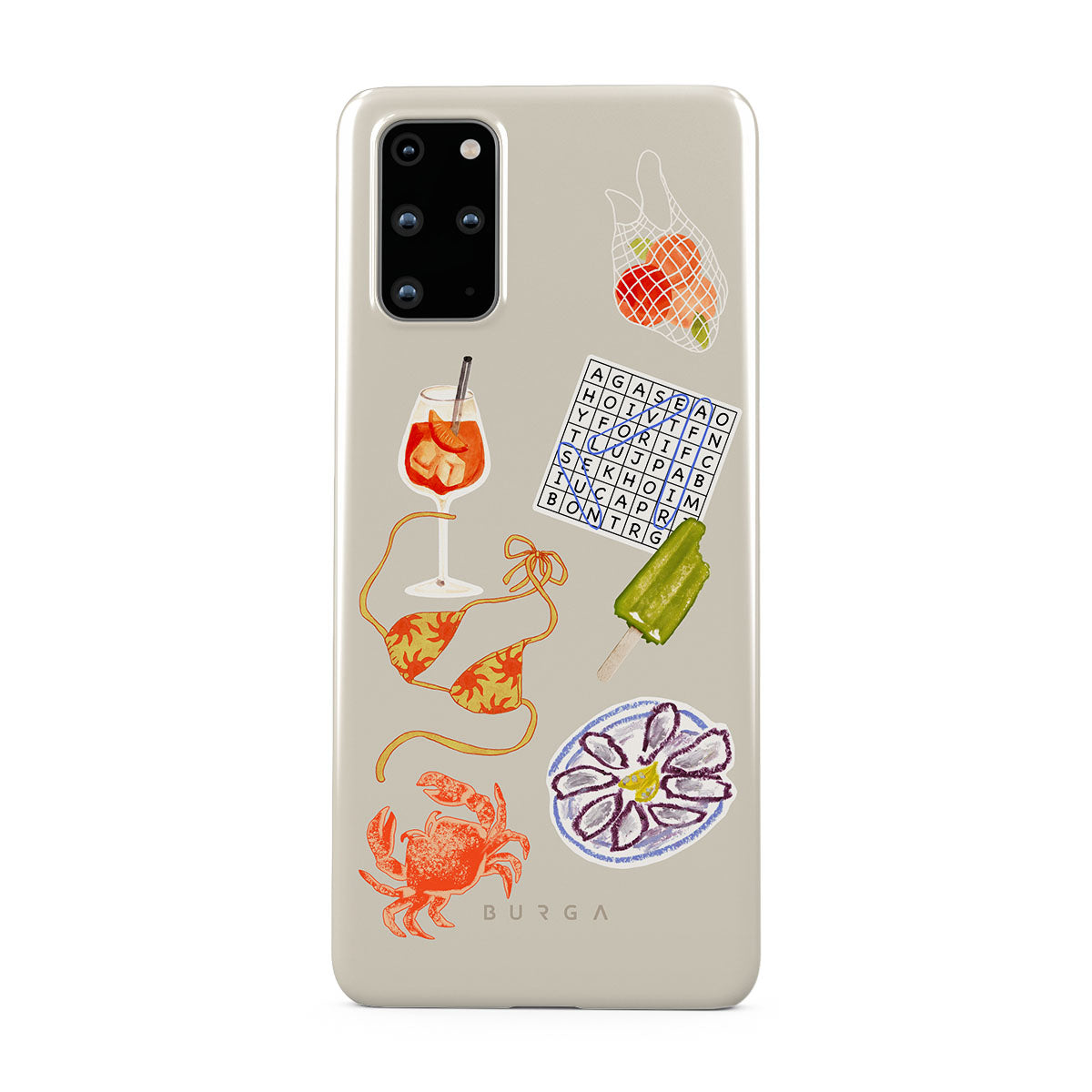 Kenmerken van dit design: krab, bord met oesters, ijsje, kruiswoordpuzzel, spritz-cocktail, bikinitop, fruit.