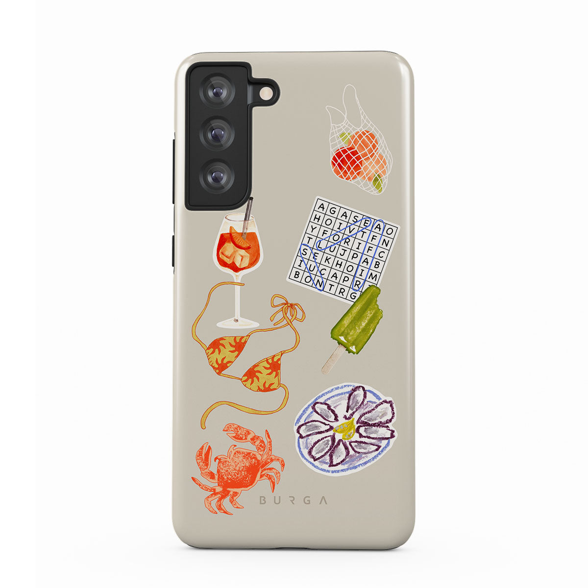 Kenmerken van dit design: krab, bord met oesters, ijsje, kruiswoordpuzzel, spritz-cocktail, bikinitop, fruit.
