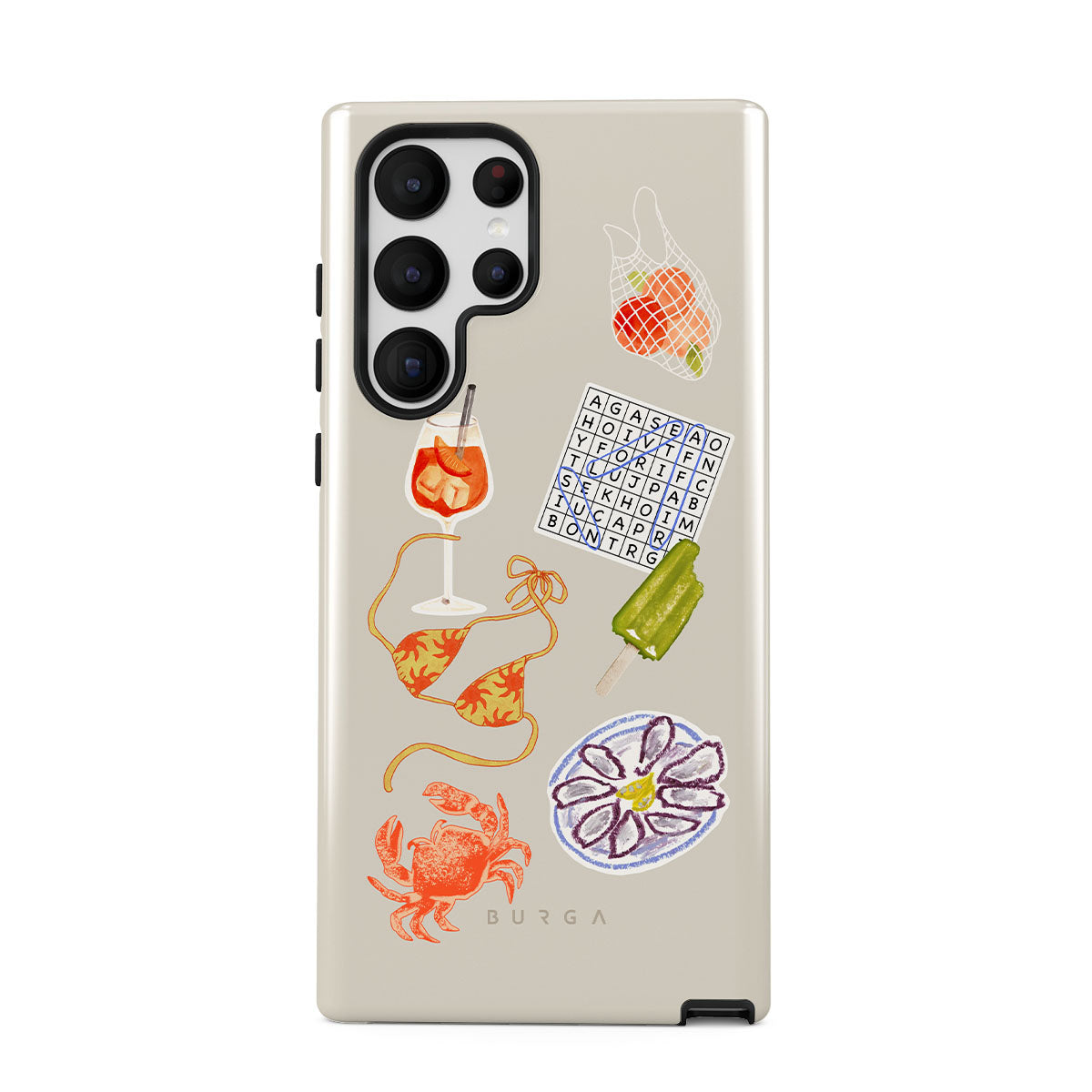 Kenmerken van dit design: krab, bord met oesters, ijsje, kruiswoordpuzzel, spritz-cocktail, bikinitop, fruit.