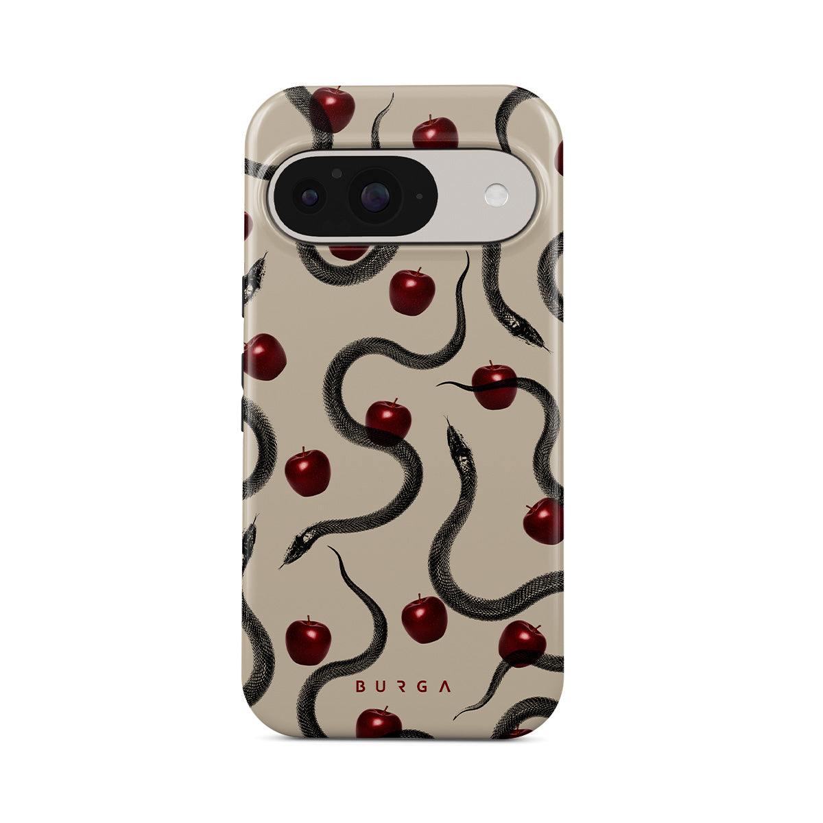 Dit ontwerp bevat: glanzende rode appels, opgerolde slangen, beige tinten.