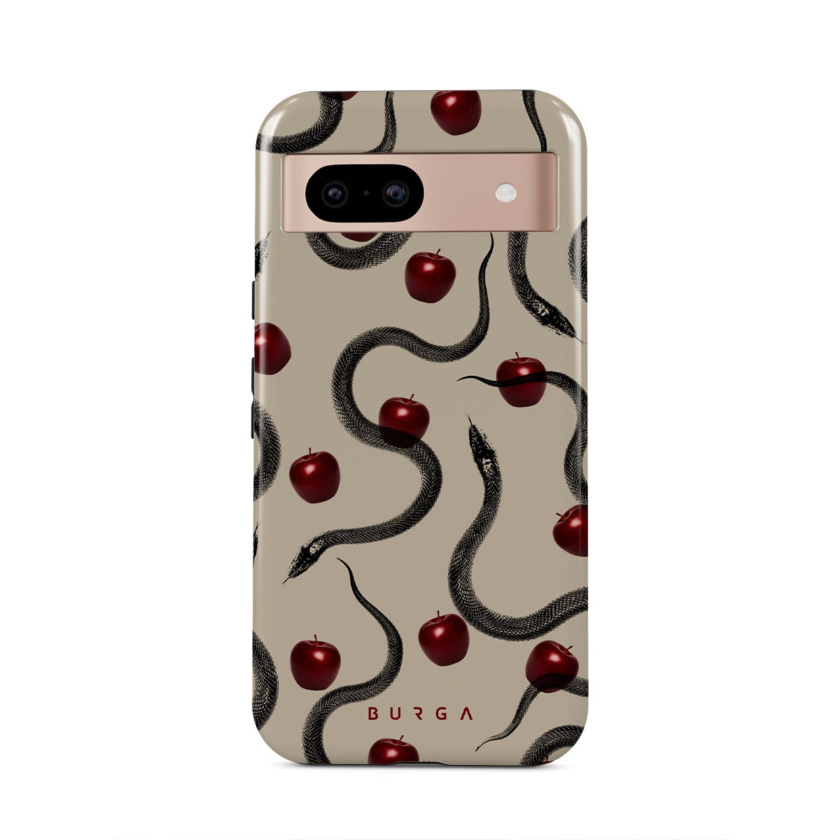 Dit ontwerp bevat: glanzende rode appels, opgerolde slangen, beige tinten.