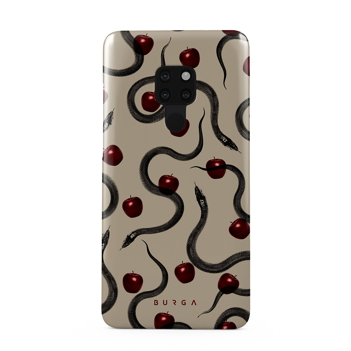 Dit ontwerp bevat: glanzende rode appels, opgerolde slangen, beige tinten.