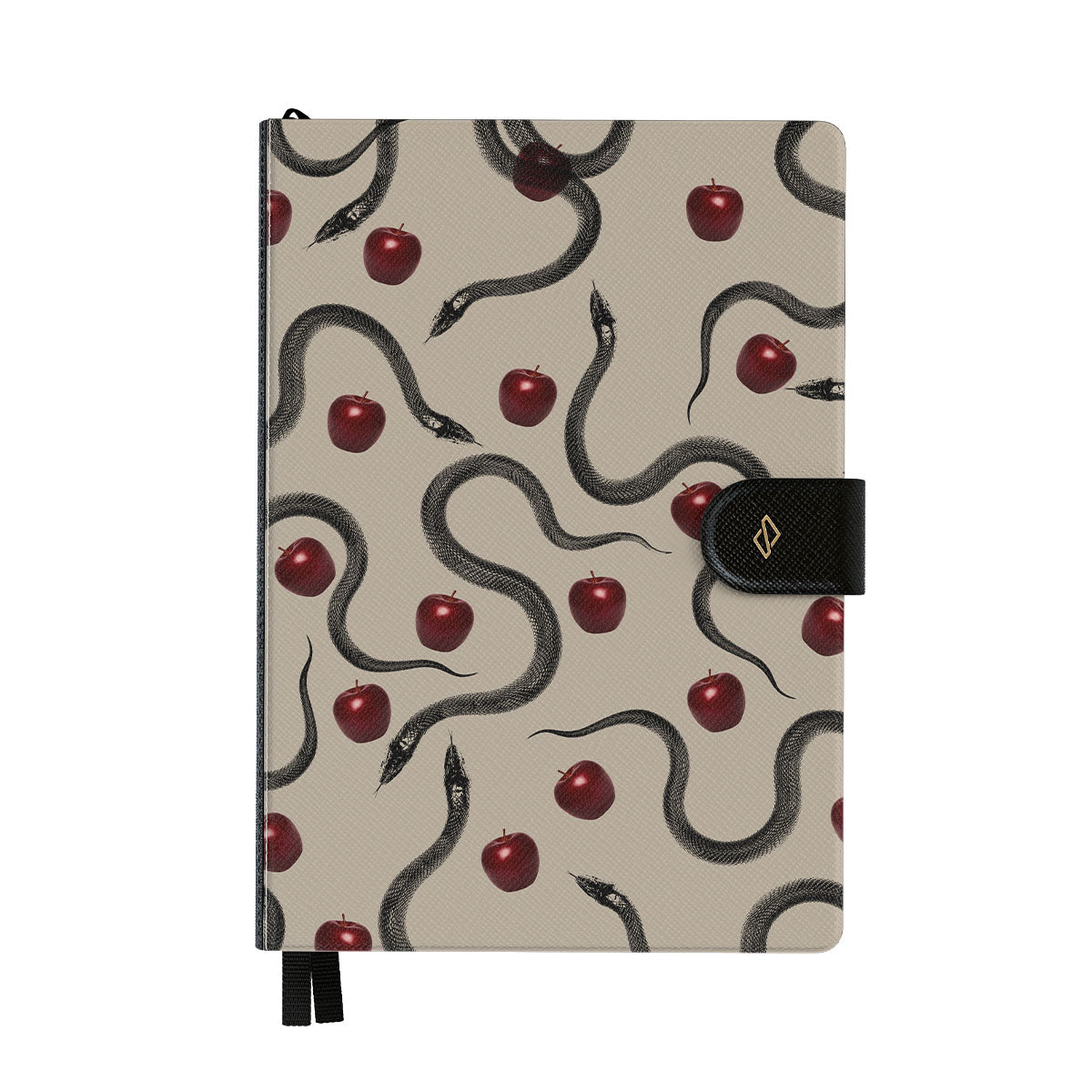 Dit ontwerp bevat: glanzende rode appels, opgerolde slangen, beige tinten.