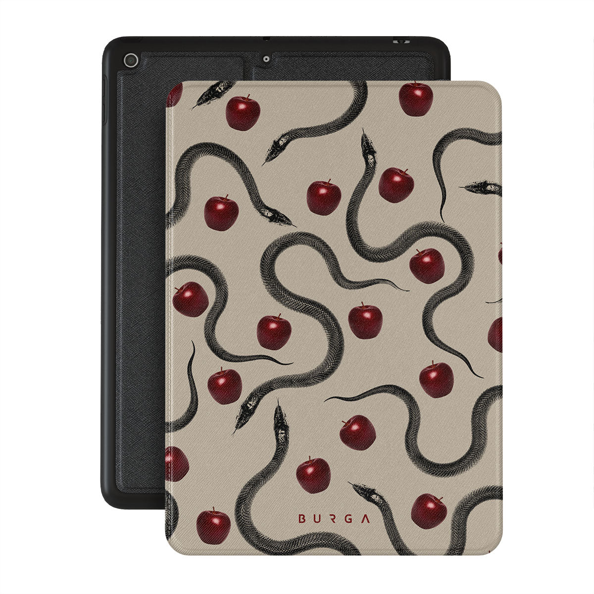 Dit ontwerp bevat: glanzende rode appels, opgerolde slangen, beige tinten.