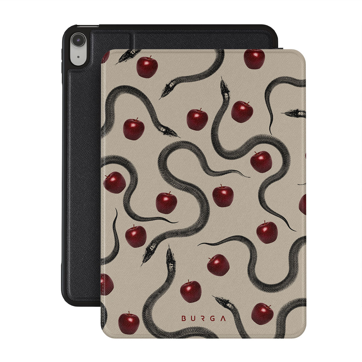 Dit ontwerp bevat: glanzende rode appels, opgerolde slangen, beige tinten.