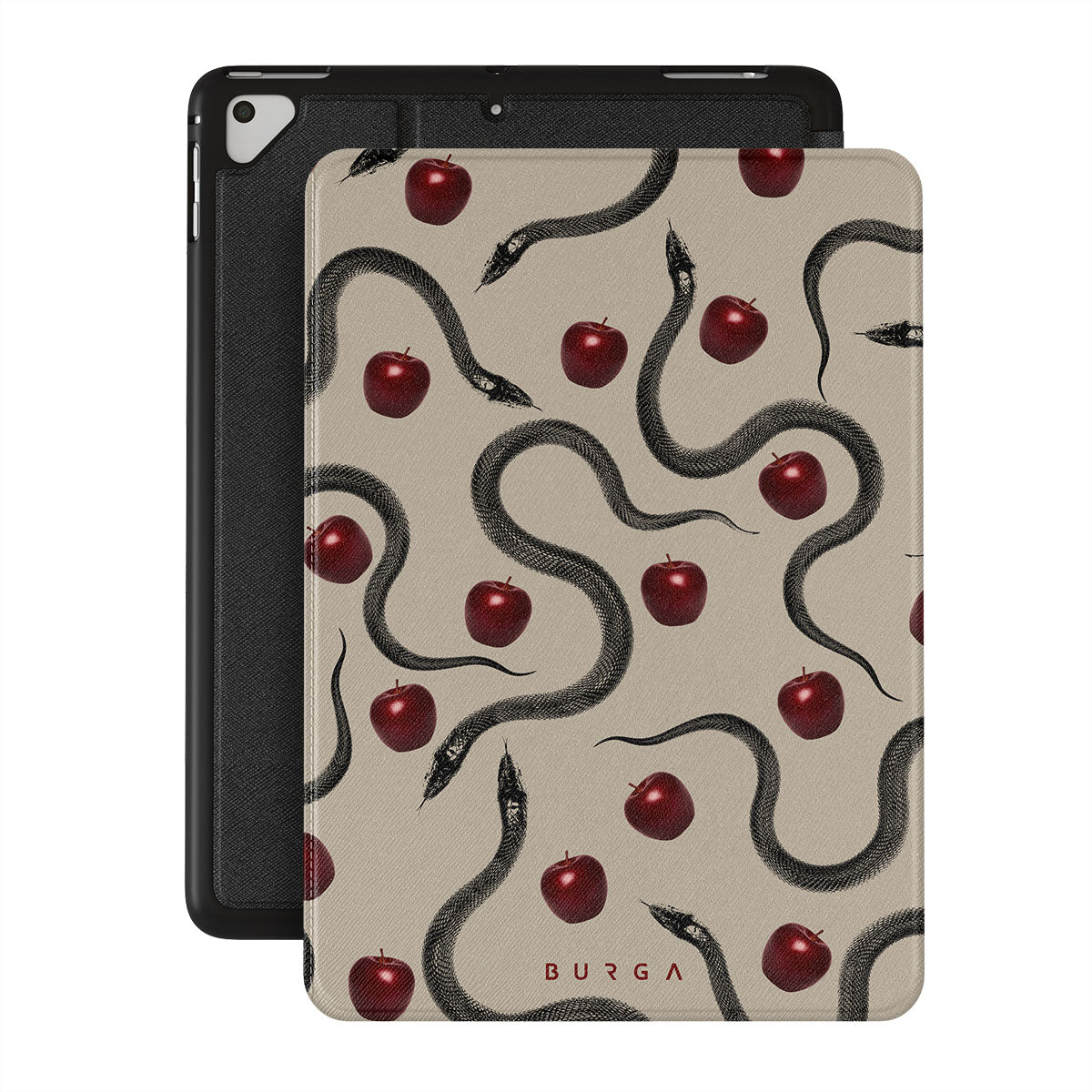 Dit ontwerp bevat: glanzende rode appels, opgerolde slangen, beige tinten.