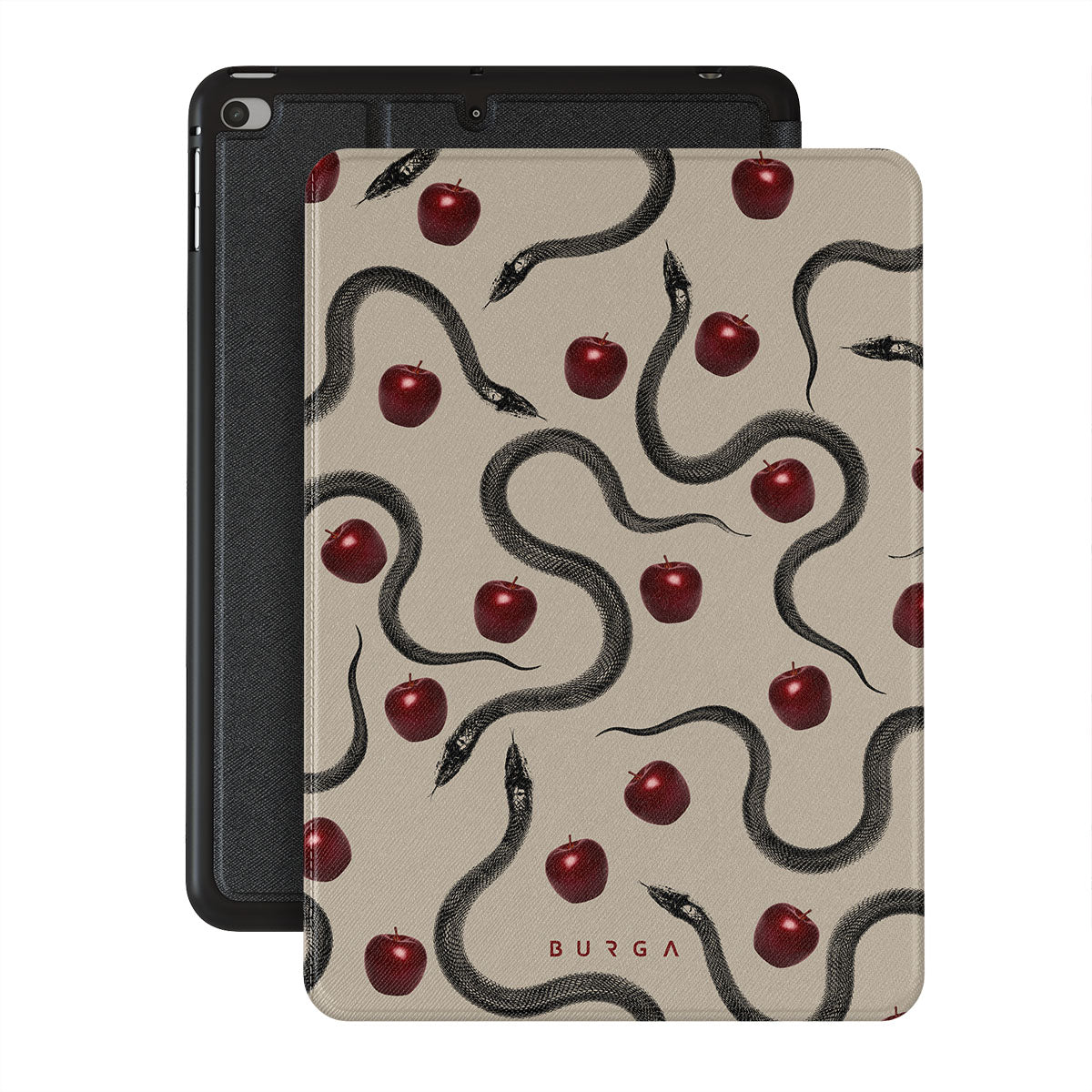 Dit ontwerp bevat: glanzende rode appels, opgerolde slangen, beige tinten.