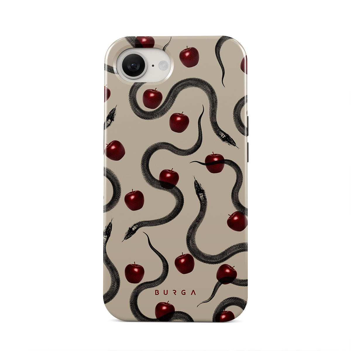 Dit ontwerp bevat: glanzende rode appels, opgerolde slangen, beige tinten.