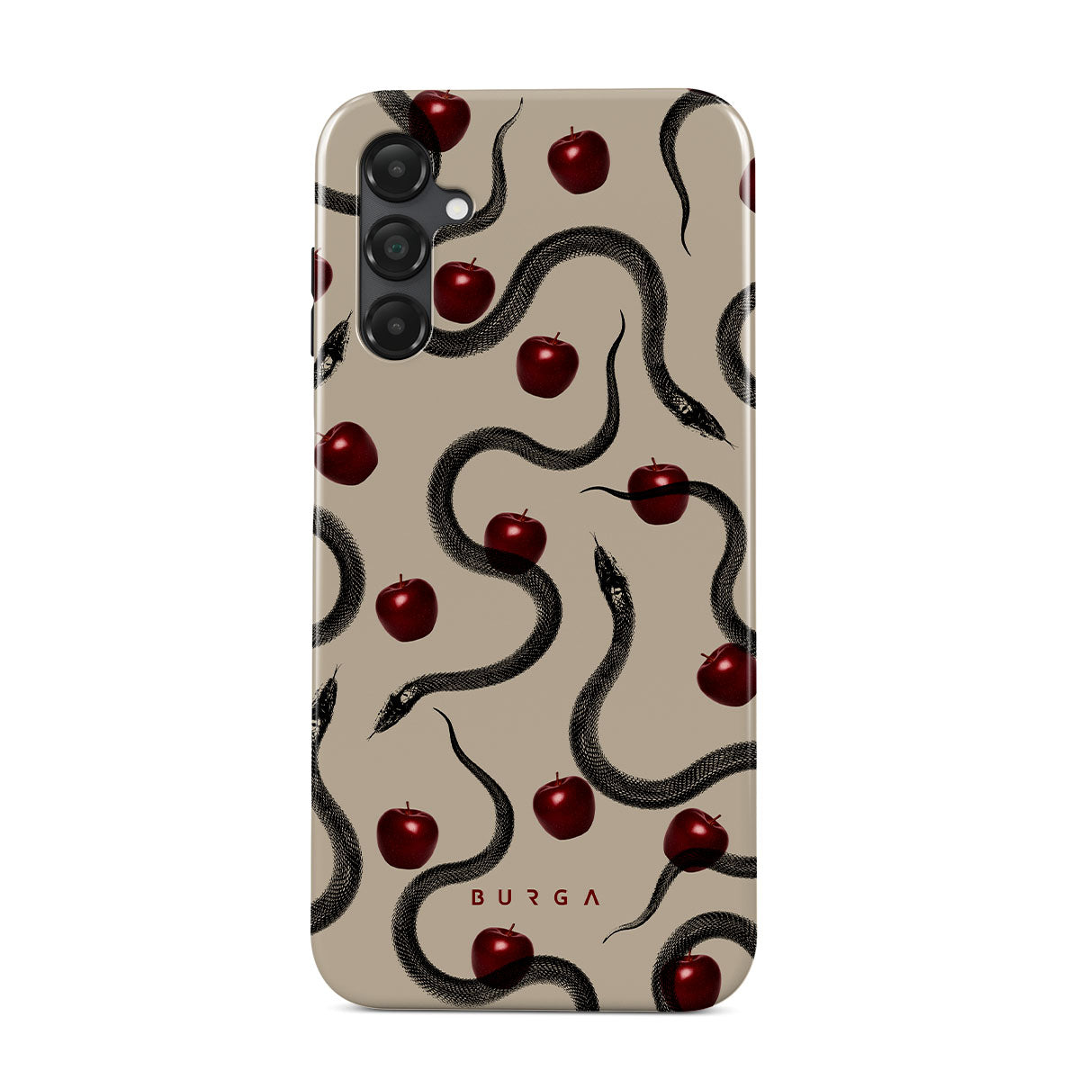 Dit ontwerp bevat: glanzende rode appels, opgerolde slangen, beige tinten.