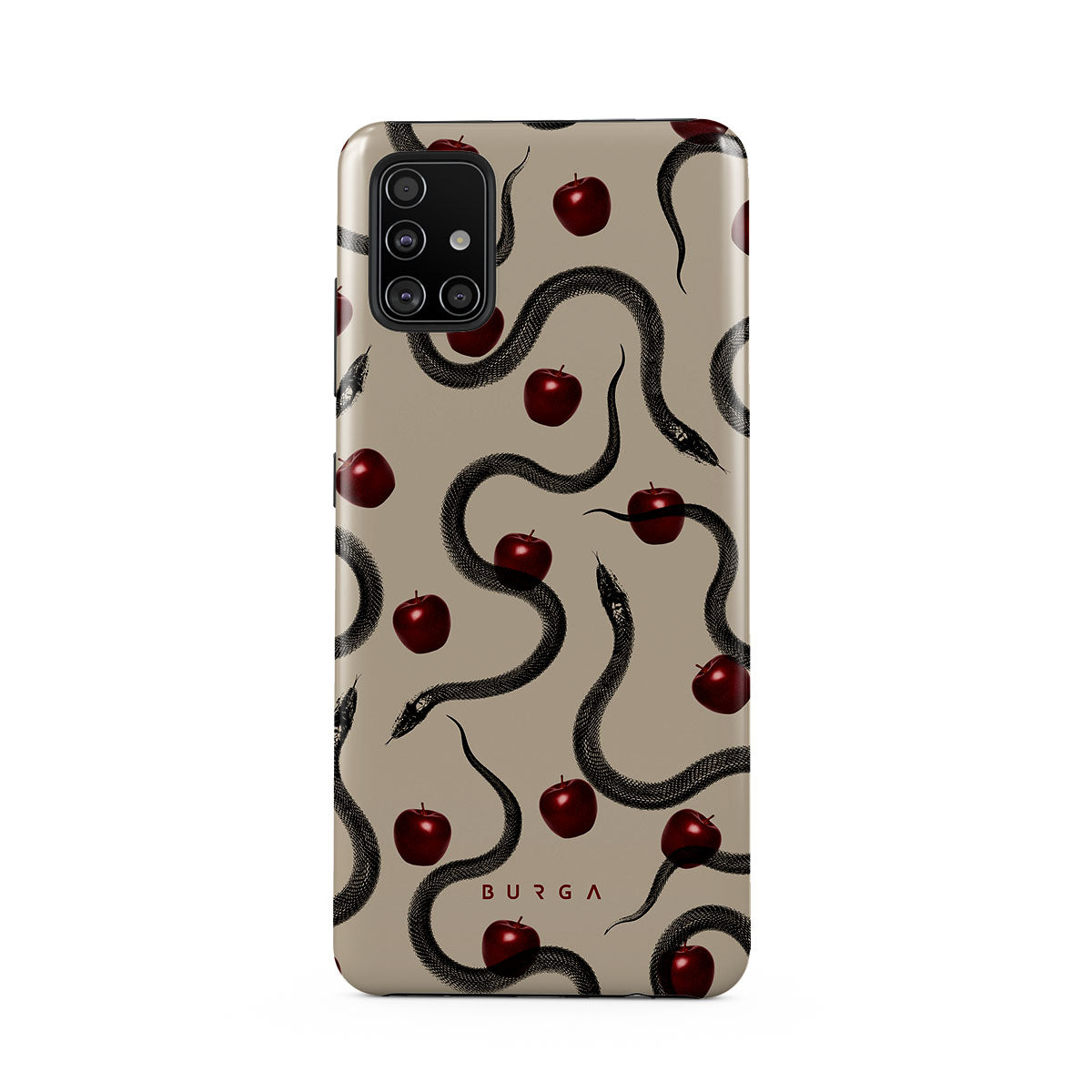 Dit ontwerp bevat: glanzende rode appels, opgerolde slangen, beige tinten.