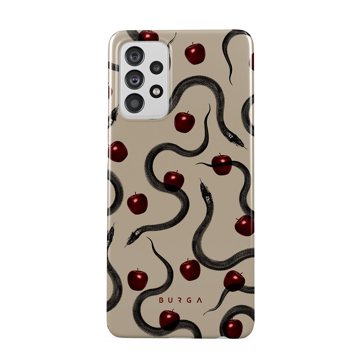 Dit ontwerp bevat: glanzende rode appels, opgerolde slangen, beige tinten.