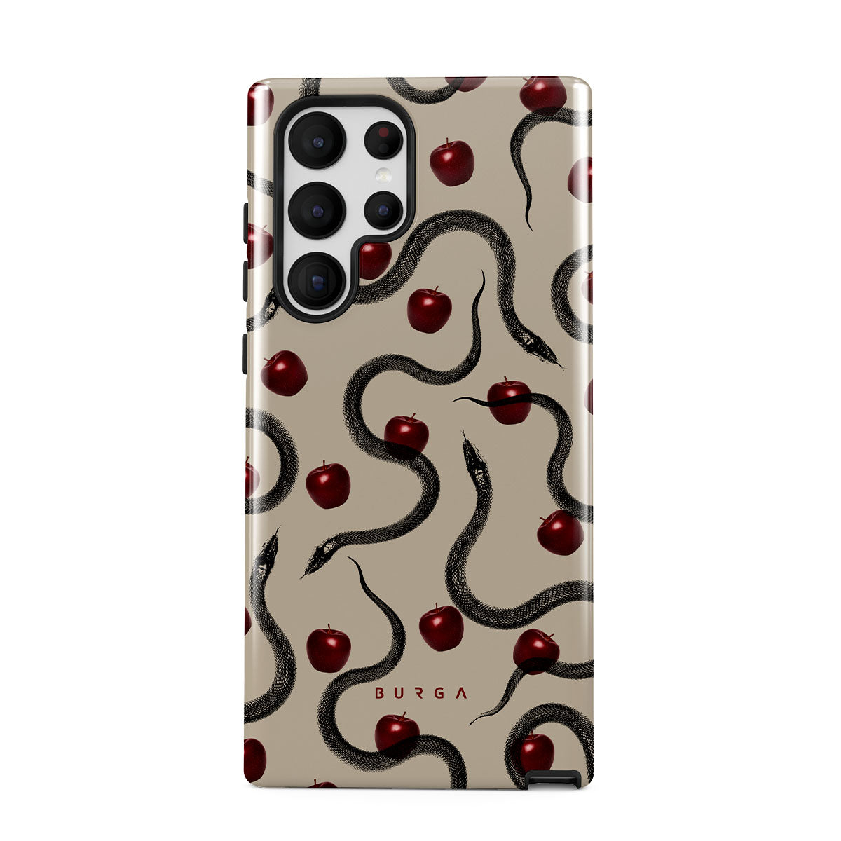 Dit ontwerp bevat: glanzende rode appels, opgerolde slangen, beige tinten.