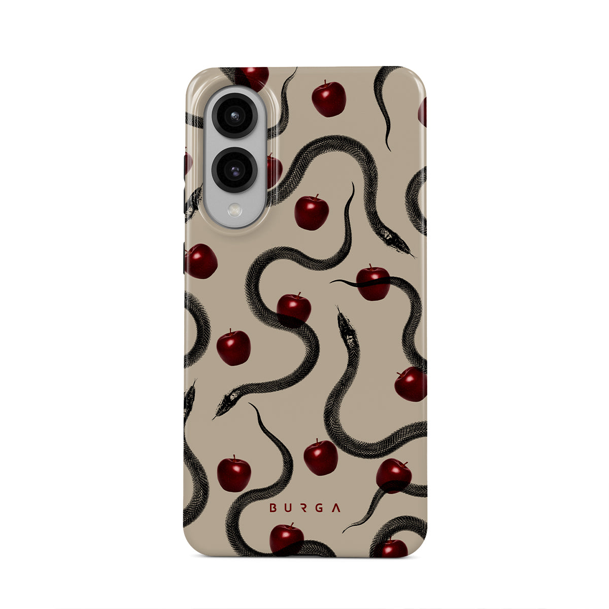 Dit ontwerp bevat: glanzende rode appels, opgerolde slangen, beige tinten.