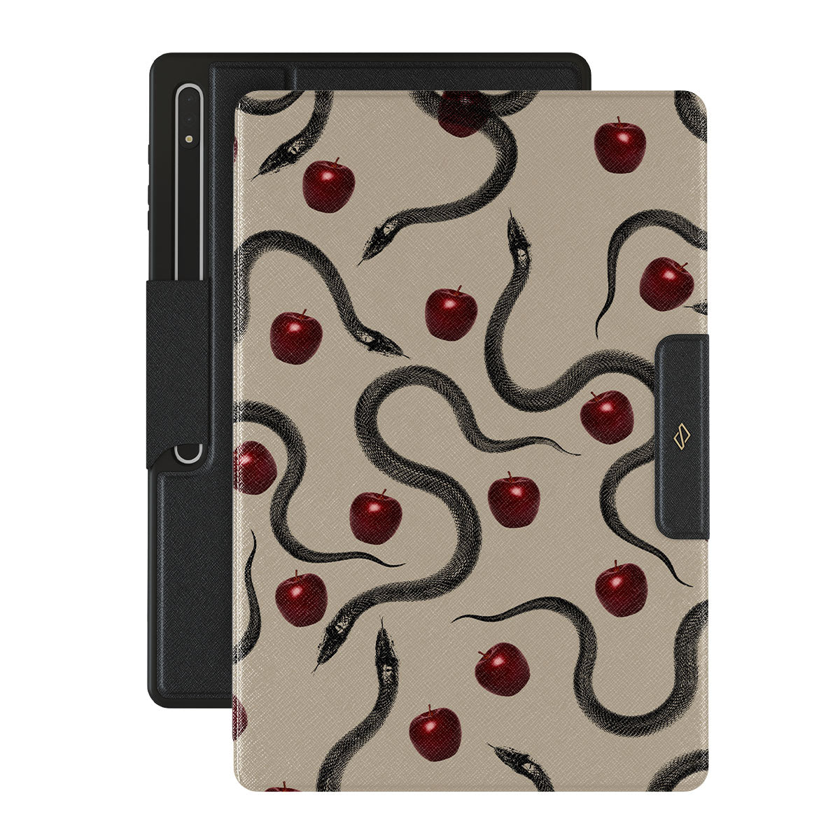 Dit ontwerp bevat: glanzende rode appels, opgerolde slangen, beige tinten.