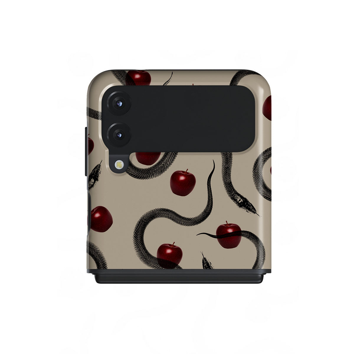 Dit ontwerp bevat: glanzende rode appels, opgerolde slangen, beige tinten.