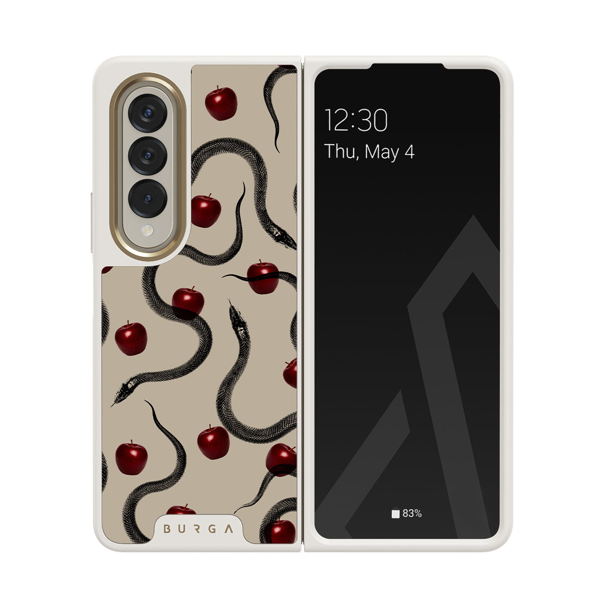 Dit ontwerp bevat: glanzende rode appels, opgerolde slangen, beige tinten.