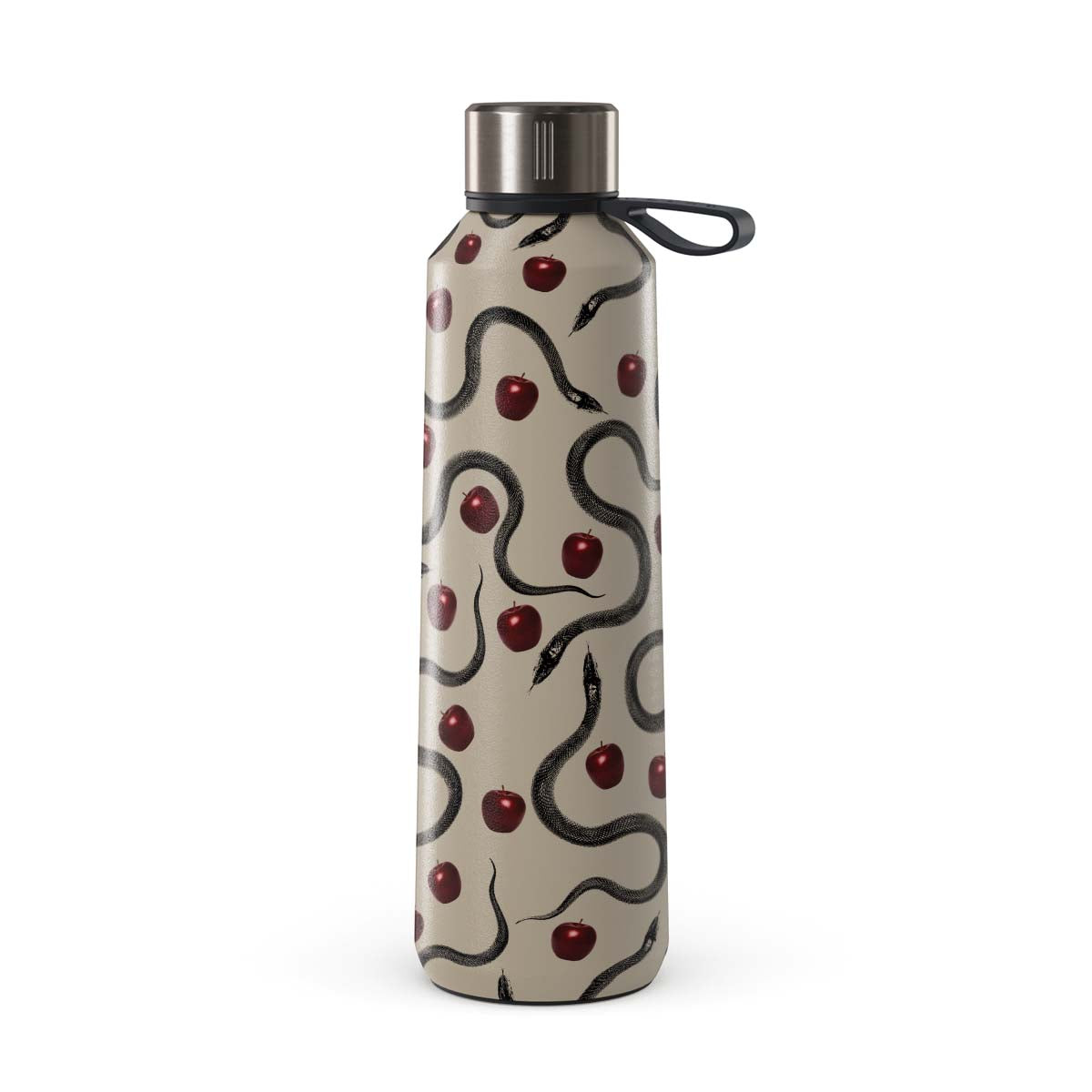 Dit ontwerp bevat: glanzende rode appels, opgerolde slangen, beige tinten.