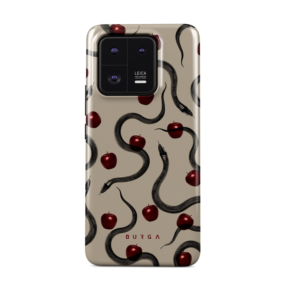 Dit ontwerp bevat: glanzende rode appels, opgerolde slangen, beige tinten.
