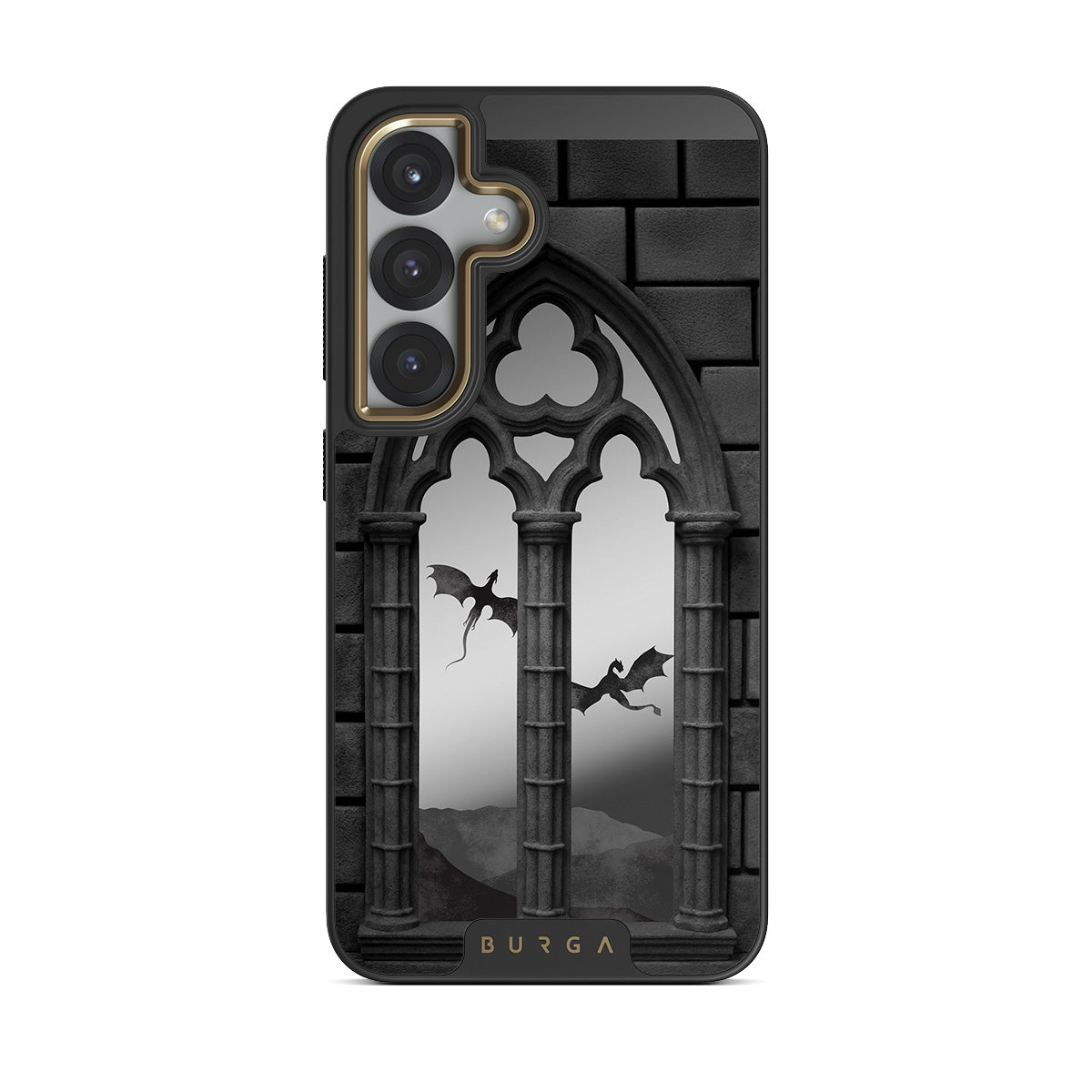 Kenmerken van dit design: gotische bogen, vliegende draken, mystieke wezens, spiegelinvoeging