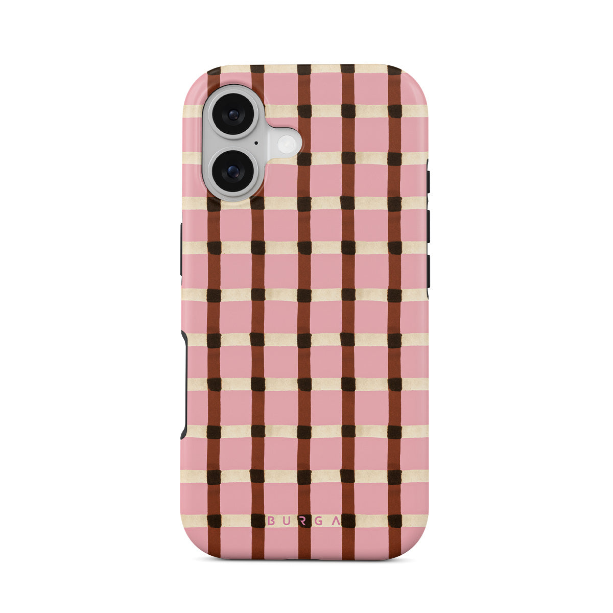 Kenmerken van dit design: een roze en bruin geruit patroon, een gingham-patroon