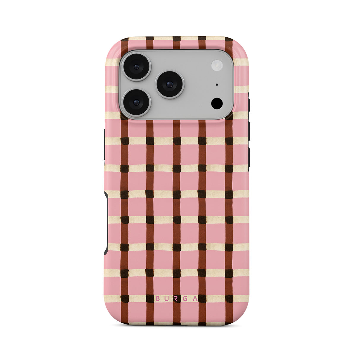 Kenmerken van dit design: een roze en bruin geruit patroon, een gingham-patroon