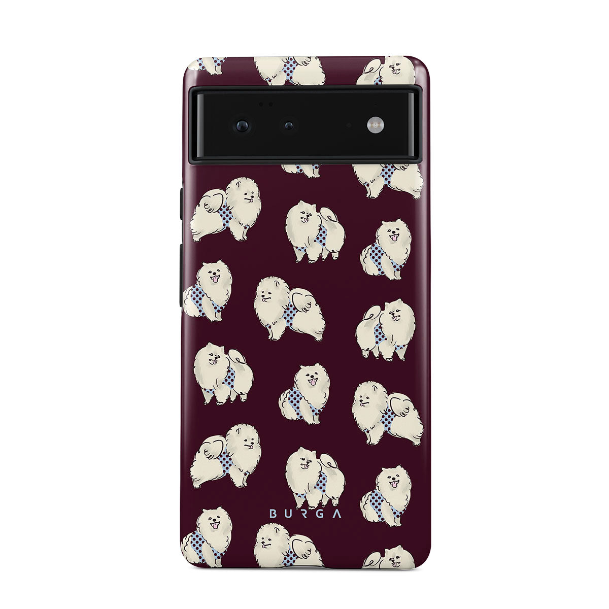 Kenmerken van dit design: witte pluizige honden op een diepe bordeauxrode achtergrond, poedels, huisdieren.