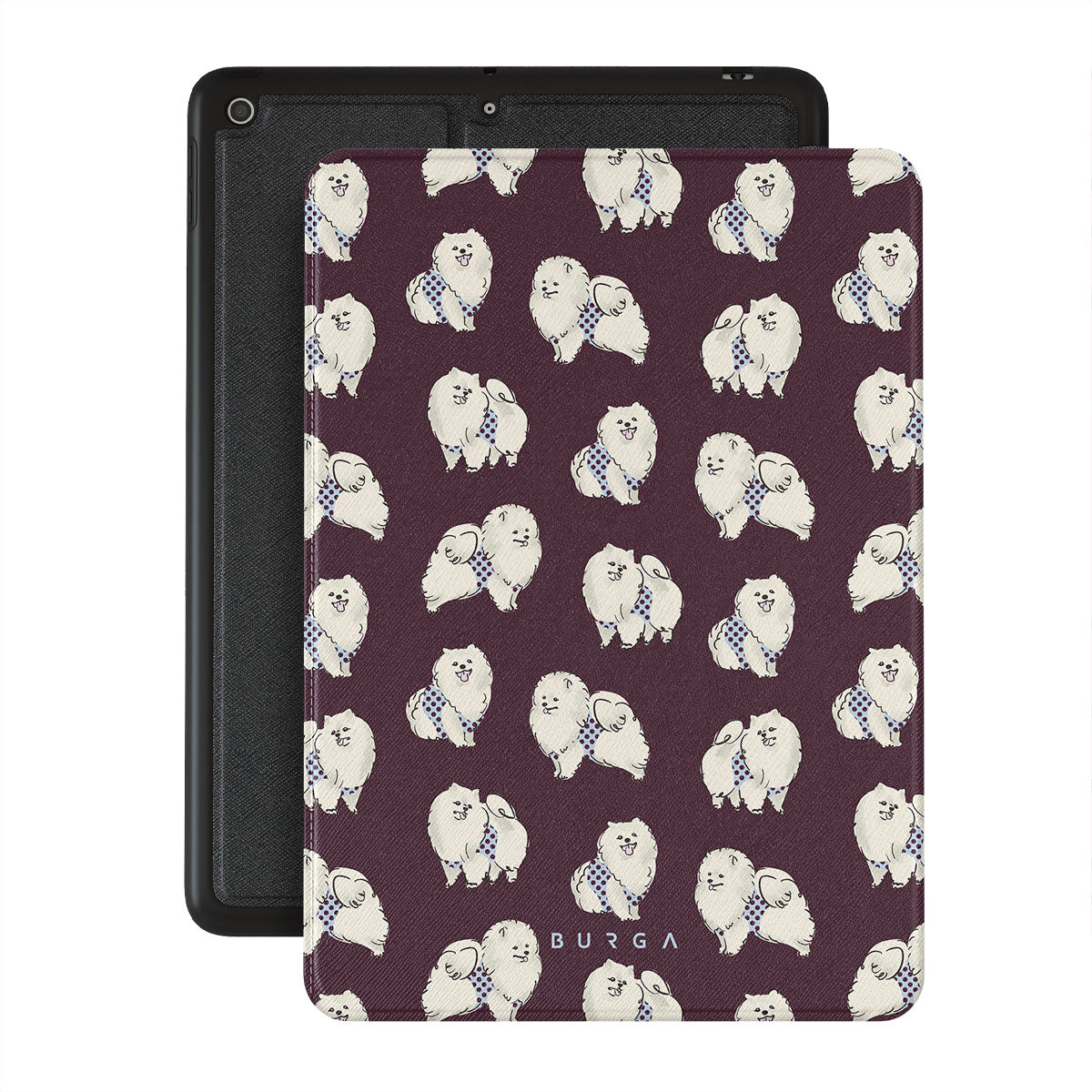 Kenmerken van dit design: witte pluizige honden op een diepe bordeauxrode achtergrond, poedels, huisdieren.