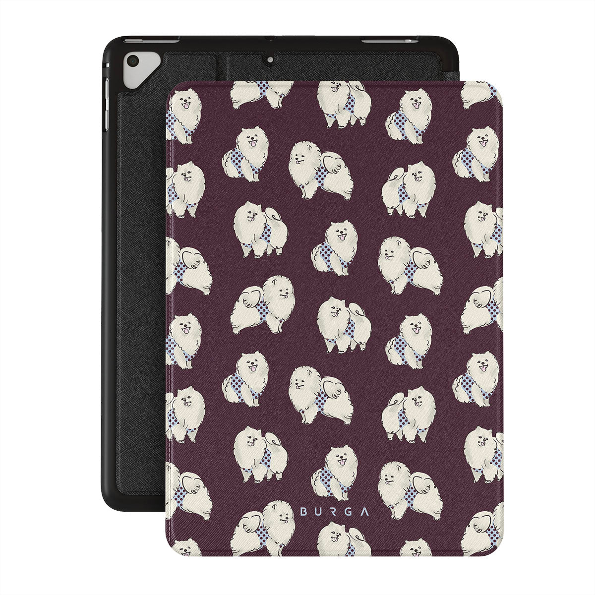 Kenmerken van dit design: witte pluizige honden op een diepe bordeauxrode achtergrond, poedels, huisdieren.