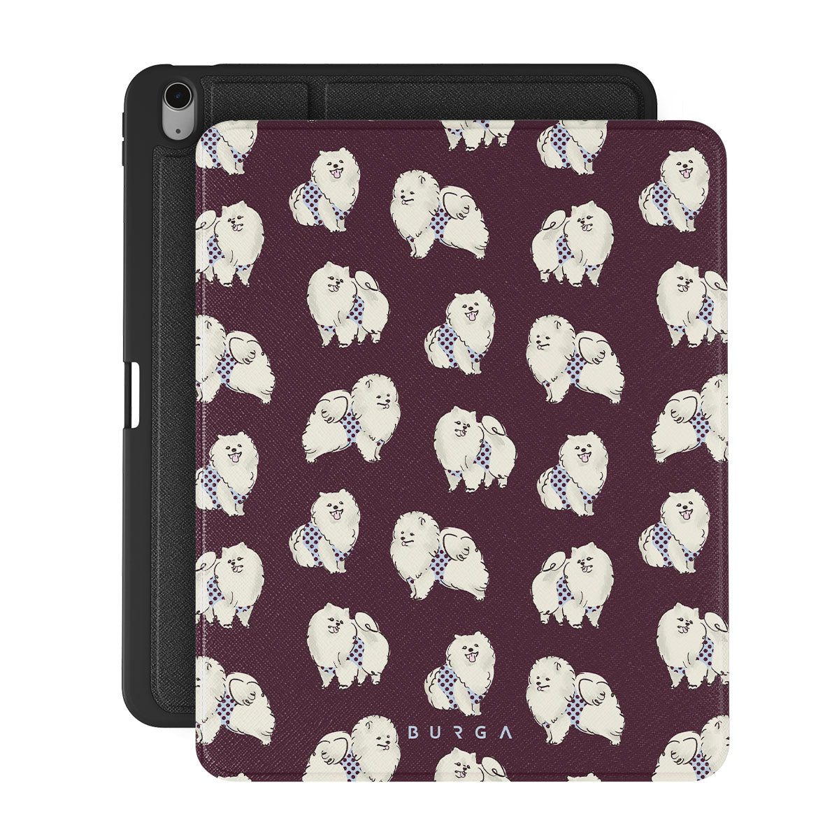 Kenmerken van dit design: witte pluizige honden op een diepe bordeauxrode achtergrond, poedels, huisdieren.